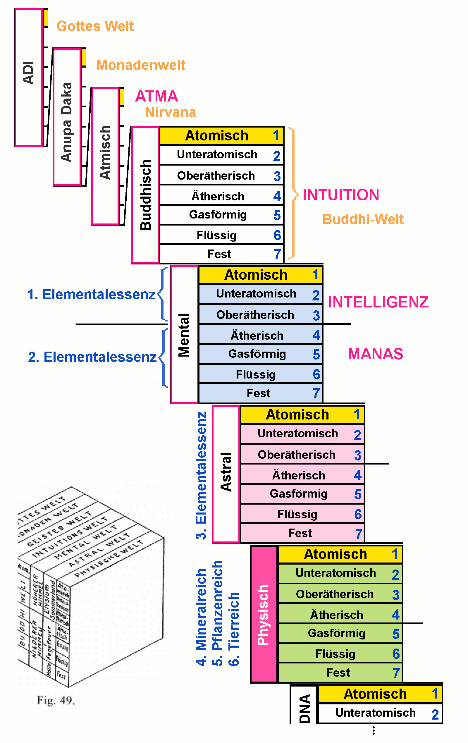 Abb.3: Ausschnitt aus dem vedischen Weltenaufbau, nach unten fortzusetzen. Am Anfang war ein Hauch Wir stecken sozusagen in einer Art Kristall. Die Plätze sind festgelegt und nur ein Zittern am Ort ist möglich, wie die kurzen Fäden eines Teppichs, nur drei- und höherdimensional, um es sich ungefähr vorzustellen. Die koordinierten Bewegungen der Teppichfädchen erschaffen alle höheren und schließlich auch unsere Welt. Am Anfang war das Wort? Wohl eher war es ein Hauch. Da gibt es ganz kurze Nickbewegungen, das sind die allerhöchsten Frequenzen. Sie ähneln sehr dem ungeordneten Zittern. Aber wenn sie auf eine Weise geordnet sind, dass sie stabil erhalten bleiben, kann man es Struktur nennen. Das „neu entstandene” sind also „Löcher”, wie Windstöße (ohne jedweden Wind), nur Wellen von Nicht-Koilon. Das heißt, es ist Koilon, dass sich koordiniert zur Seite neigt. Diese kleinen Löcher werden auch Blasen genannt. Sie bauen Torkados auf, das sind unsymmetrische Raumwirbel, torusähnlich. Ihre vielen inneren Strömungen öffnen, drehen und schließen sich. Sie bewegen sich im Ganzen auch vorwärts, wie ein Tornado, daher der Name Torkado. Wenn sie sich auch im Ganzen schnell drehen, bekommen sie Masse. Das ist der selbsterzeugte Sog, der beim Tornado die Dächer zerstört. Und wie bei den schräg drehenden Billardkugeln entstehen auch neue gekrümmte Bahnen. Und jetzt kommt der Witz: Die Bahnen koordinieren sich und werden zu stabilen Überwirbeln. Das sind die Wirbel der nächsten Stufe, die innen und außen, und zwar senkrecht zur schnellsten Strömung, ebenfalls dem Ganzen überlagerte Unterdruckwellen erzeugen. Das ist gut bekannt aus der Gas- und Hydrodynamik. Es bedeutet nur langsamere Nickbewegungen des Koilon. Die ganz schnellen Nickbewegungen bleiben ungestört dort, wo sie waren. Die Bewegungen modulieren sich gegenseitig. Verschachtelte Welten sind das, genauer gesagt: verschachtelte Wirbel. Das Göttliche Periodensystem So, das ist nur Stufe Zwei des allergöttlichsten Periodensystems. Diese gröbere Sorte von Wirbeln bildet wieder Zweiergruppen (lichtartig) und Dreiergruppen (materieartig) und spielt alle weiteren machbaren Kombinationen durch, wie man das Koilon verdrängen kann. Ergebnis ist die Festkörper-Ebene als siebente Hierarchie der Allergöttlichsten aller Welten. Bei Hierarchie Nummer Acht zerfällt alles wieder, aber nur, um sich umzusortieren in einen perfekten Anu-Torkado, ein weiteres göttliches Uratom, ein göttliches Anu mit genau zehn Spiralen, die bereits eine Spirille (eine Art Wendel) tragen. Ab hier beginnt das gleiche Spiel, die Welt Nummer Zwei. Wieder sieben Kondensationen (Aggregatzustände), die aufeinander aufbauen. Alle modulieren nur das Koilon. Und so geht es weiter. Die physische Welt – das ist die, auf die unsere Technik Zugriff hat – hat in den physischen Uratomen schon siebenfache Spirillen, ist also 7*7=49 Aggregatzustände entfernt vom „Anfang”, der für Menschen gilt. Die göttlichen Aggregatzustände (unser Zentrum) sind dort noch drin, als feinste Modulation. Würde man sich körperlich auf sie einstimmen (wäre möglich), ohne Schutz, verbrennt der ganze Rest, da unsere Welt in 48 Stufen heruntergekühlt ist. Dieser „Besuch” wäre ein Oneway-Ticket. Wenn man fragt, wieso das alles stabil ist: Der Goldene Schnitt (GS) ist der Schlüssel zur Wirbelform, wegen der Einmaligkeit der Konvergenz von x = Eins durch x minus 1. Die 1 (und mit ihr auch F = 1,61803) skaliert sich jedesmal neu. Sie ist die Wellenlänge der Umgebungs-Schwingung und verkoppelt beide zur gegenseitigen Ernährung. Das Invertieren via 1 durch x passiert zweimal pro Umlauf. In die großen Radien hinein am Nordpol, in die kleinen Radien hinein am Südpol der Torkados. Der Nordpol muss größer sein, weil ein Sog-Überschuss gebraucht wird. Wenn man nach dem Antrieb fragt: Ordnung schaffen macht Platz. Sogenanntes biologisches Wachstum schafft diese Ordnung, es zieht die Uhr der „Löcher-Stürme” auf, wie bei einer alten Kuckucksuhr. Die Kuckucksuhr der Welten ist ein passendes Bild: Jeder Zeiger und das Erscheinen des Kuckucks stellen verschiedene Rhythmen dar, analog und digital. Und sie muss aufgezogen werden über ein Räderwerk. Jedes keimende Blatt gibt dem Universum neuen Schwung, jede sich teilende Bakterienzelle. Die ordnungsbildenden Neuanfänge gibt es auf allen Skalen. Bewusstsein und Seele Übrigens, alles – die vielen feinstofflichen Flüsse, die physischen und auch gröbere – zählen zu den vielen Formen von Bewusstsein. Das Hauptmerkmal ist die Ordnung, das Dienen zum Wohle der Ganzheit. Unser gesunder Körper führt es vor. Jedes Organ, jede Zelle darin, jede Zellorganelle, sie alle erfüllen ihre Aufgabe. Bewusstsein kann auch sehr individuell sein, in sich souverän, wieder wegen dem Goldenen Schnitt, der die Nicht-Resonanz fördert, die Trennung. Am Punkt der größten Irrationalität in Frequenzverhältnissen fehlen die gemeinsamen Teiler zur Übergabe von Information. Dann wird Bewusstsein manchmal auch blind und kann aus Dummheit und Gier in die große Kuckucksuhr der Welten treten. Ich schätze, nur DANN fliegen Planeten, Sonnen und Galaxien auseinander. Die Atome, Pflanzen und Tiere kämen NIE auf dafür ursächliche Ideen. Sie folgen bereitwillig ihrer artspezifischen Gruppenseele, als integrale Vertreter ihrer Art. Die Menschenseelen existieren in Seelenfamilien mit unterschiedlicher Themenplanung und verschieden hoher Ansiedlung in den höheren Welten, wo auch mal überhöhtes Ego, Abspaltung und Machtmissbrauch zeitweise ein Thema sein kann. Da auch Seelen sich entwickeln – aber nur parallel zur Körper-Erfahrung! – werden sie am Ende auch in den höchsten Menschenwelten keine Aufladungen mehr tragen. Und das, obwohl Aufstieg das Gegenteil von Kondensation ist, also Dissoziation, gleichbedeutend mit Ladungstrennung. Das heißt, die in einem komplizierten dunklen Leben erworbene Ordnung bleibt erhalten, we