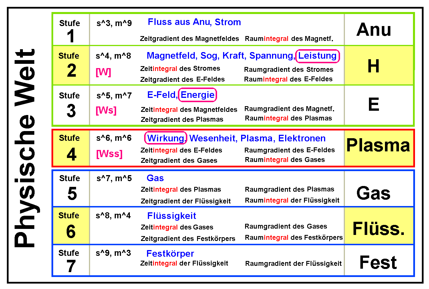 Abb.6: Aggregatszustandstabelle (AGZ). Die 7 Stufen der Physischen Welt werden von 1 bis 7 durchnummeriert und bezeichnet als Anu, H, E, Plasma, Gas, Flüssigkeit und Festkörper. Es sind Aggregatzustände, die aufeinander aufbauen. Die Stufe 1 hat 3 Zeitdimensionen und 9 Raumdimensionen, die Stufe 2 eine Zeitdimension mehr und eine Raumdimension weniger (Einheit Watt). So geht es weiter. In Stufe 4 ist die größte Beweglichkeit, weil die Dimensionszahl symmetrisch ist: 6 Zeit und 6 Raum (Einheit Watt mal Sekundequadrat, siehe Plancksches Wirkungsquantum „h“), und der Festkörper hat 9 Zeitdimensionen und 3 Raumdimensionen. Verkopplung: Jede Stufe ist das Zeitintegral der Vorgängerstufe und das Raumintegral der Nachfolgerstufe. Umgekehrtes gilt für die Gradienten, wobei aber Information verloren geht. Man sieht: Zeit ist Strömung nach innen, Raum entsteht bei Strömung nach außen. Kondensation von oben nach unten: Jede Überwirbel-Hierarchie bekommt eine eigene Zeitkomponente hinzu, weil mit der neuen Drehachse auch eine neue innere Rhythmik beginnt. Gleichzeitig verliert jeder neue Überwirbel einen räumlichen Freiheitsgrad, denn es sind Bindungen entstanden, eine Fesselung. Die Wellengleichung von oben ist exakt wiederzuerkennen. Aber man sieht: An jeder Welle sind immer mehrere Aggregatzustände beteiligt: Zwei Zeitgradienten nach oben und zwei Raumgradienten nach unten. Um die Stufe 4 herum findet der Elektromagnetismus statt. Nur bezweifle ich, dass beide Geschwindigkeitskonstanten identisch sind. Man wird ein Produkt aus zwei unterschiedlichen Größen schreiben müssen und kein Quadrat mehr wie v*v = v hoch 2. Natürlich gilt das in allen Stufen und setzt sich einfach fort. Die Gasdynamik hat ihre zentrale Wellenfunktion in Stufe 5 angesiedelt, die Hydrodynamik in Stufe 6. Magnetkraft übergeordnet Und natürlich könnte es auch „Wellengleichungen“ mit drei, vier oder mehr Ableitungen in Raum und Zeit geben. Der Festkörper ist der fünfte Raumgradient des Magnetfeldes und gleichzeitig sein fünftes Zeit-Integral. Man beachte: Die Stufe 2, von den Physikern Magnetfeld genannt, ist dem Festkörper übergeordnet, war eher da und existiert auch unabhängig vom Metall, an dem es gemessen und mit dessen Hilfe es technisch erzeugt wird. Die Strömungsart der Stufe 2 ist ja am Aufbau des Metalls der Stufe 7 beteiligt, wie an allen anderen Stufen dazwischen. Der elektrische Strom im Draht bewirkt nur eine zusätzliche „Verdampfung„ (über Gas und E-Feld hinaus). Jeder Aggregatzustand hat seinen eigenen Puls und damit seine eigene Lichtgeschwindigkeit. Am schnellsten tickt die Stufe 1, die Grundlage von allem: Es sind Paare aus Anu, die sich aus überzwirbelten Wirbeln von Stufe 7 der darüberliegenden Astralwelt auskoppelten. Prof. Konstantin Meyl nennt sie Neutrinos. Und es gilt auch nach unten für die Anu auf Stufe 1 der nachfolgenden biologischen Welten der Biomoleküle wie DNA, dann der Zellen und der Organe. Und deshalb sollten wir uns nicht wundern über unsere schleimbeutelartigen biologischen Körper. Alle möglichen Aggregatzustände sind sinnvollerweise beteiligt am Aufbau, an der Ernährung, der Umwandlung und Entsorgung, wenn die optimale Licht-Ernährung nicht zur Verfügung steht. Das ist vermutlich in allen Stufen ähnlich, auch in den chemischen Umwandlungen. Die Moleküle trennen und vereinigen sich unter Licht- und Wärmeabgabe, das ist auch Substanz-Entsorgung. Auch ihr Schmelzen erfolgt hierarchisch, wie zum Beispiel das Verhungern in der Bio-Skala. Es erfolgt immer so, dass eine Rückkehr zum alten Normal jederzeit noch möglich bleibt. Kondensieren ist der Weg nach unten in der Tabelle. Der dimensionale Informations-Übertrag, der beim Kondensieren räumlich verloren geht, wird im selben Vorgang beim zeitlichen Integrieren hinzugewonnen. Jeder neu gebildet Überwirbel konserviert die vorhergehenden freien Taktungen nun als gebundenen Subwirbel. Bei der Rückkehr nach oben wird es vermutlich ähnlich sein: Modulierte Subwirbel bringen via neuer DNA variantenreichere Formen und Bahnen in den höheren Feld- und Bewusstseinswelten hervor. Nur lebendig verkoppelte Wirbelsysteme können Realität richtig abbilden. Das passte bisher noch nicht ins Weltbild. Die Lebendigkeit hat angeblich nichts in der Physik zu suchen – ihr Kardinalfehler. Es hat nicht an diesbezüglichen Reformversuchen gefehlt, aber diese waren von oben nicht gewollt. Nun kommen neue Zeiten, mit weniger oder keinen Denkverboten. Vorschläge für Physiker Wie könnte es nun anders gehen? Wir wollen also alle Bewegungen an einem Raum-Zeit-Punkt berechnen, aber auf tieferen Grundlagen basierend. Warum nicht gleich die drei senkrechten Strömungen simulieren, die in der Wellengleichung sowieso in Betracht gezogen werden? Und zwar so, wie sie durch die Gradienten untereinander verschachtelt sind. Sie sind sogar pur aufeinander rückgekoppelt, und das macht es einfacher statt komplizierter! Das stabile Strömungsverhalten bleibt dann von selbst übrig, wie bei der iterativen Berechnung von Fraktalen. Globale Qualitäten für die bei uns relevanten feinstofflichen Strömungsarten muss man da allerdings auch kennen beziehungsweise durchprobieren, solange sie uns noch unbekannt sind. Der Begriff Ladung sollte mit einer Bahnlinien-Divergenz in Verbindung gebracht werden. Denn Ladung ist keine Eigenschaft, die ausschließlich vom Teilchen (Wirbel) und seiner Subteilchen ausgehen. Sein Überwirbel-Umfeld bestimmt dessen Größe und Form durch die gegenseitige Wechselwirkung und Ernährung. Und kein Wirbel wird im Überwirbel einen Weg nehmen können, wo Form und Bahnliniendivergenz nicht zusammenpassen. Wichtig ist später das Aufgeben jeder Kreise-Symmetrie, weil es nur dann zu pulsierenden Rhythmen kommt, wenn sich benachbarte Windungen beeinflussen, innen und außen unterschiedlich. Mit reinem Sinus und Cosinus zu arbeiten, wird dann nicht mehr erlaubt sein, ein ganz neues Feld für kreative M