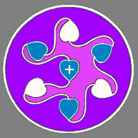 Größtmöglicher Überwirbel auf Stufe 2, aus sieben Uratomen, die nach außen hin auch räumlich nahezu neutral angeordnet sind, obwohl sie im Kern ein zusätzliches positives Uratom haben. Jeder Wirbelkern ist immer Plus, die Hülle ist Minus. Es gibt beim Vitalitätskügelchen aber keinen Dipolcharakter in der Hülle, denn Plus und Minus sind gleichverteilt. Also auch keine Pilzform, die eine Ausrichtung ermöglicht und damit existiert auch keine bevorzugte Bewegungsrichtung. Das Minikügelchen schwebt in der Luft und ist ständig am Zerfallen und Neuentstehen, deshalb die blitzende Erscheinung.