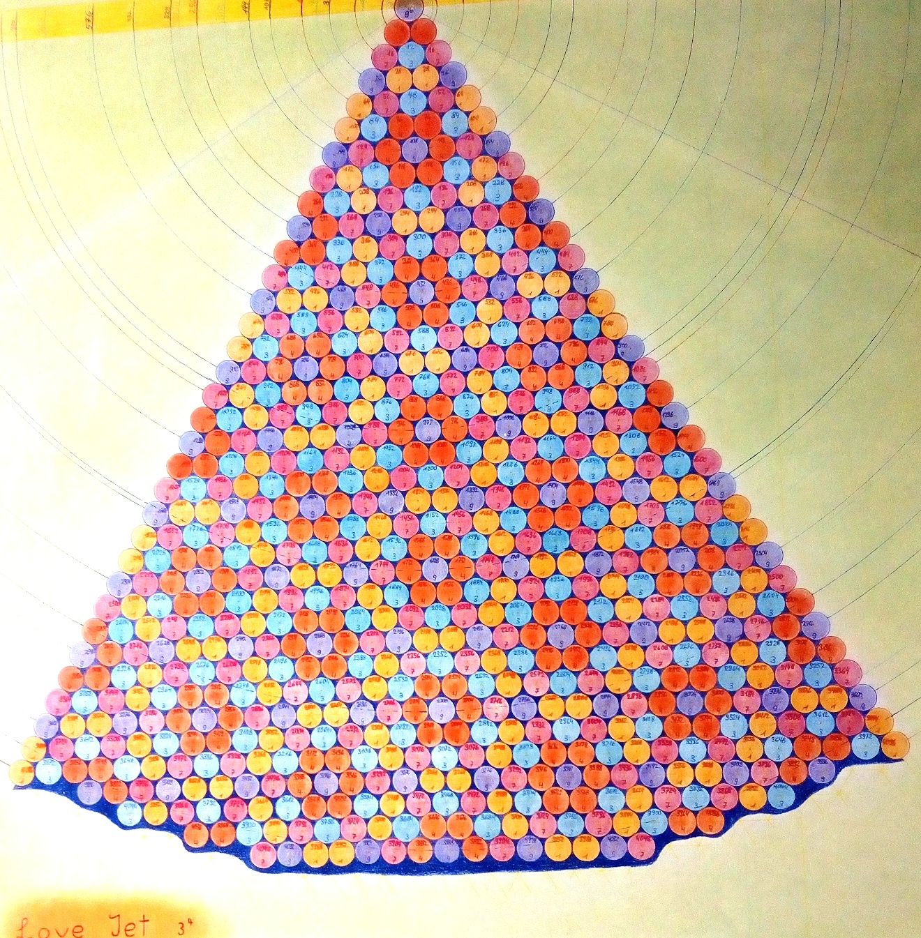 Und dann kam Kurt Moritz noch einmal zu mir. Mit einer neuen Vision. Er hatte den Love-Jet dreimal im Kreis angeordnet, wie eine sechszackige Schneeflocke. Jede zweite Love Jet-Kopie steht für eine andere Dichte der Spiralen-Trinität. Für ihn geht es dabei um Körper, Seele und Geist. Und die dazwischenliegenden dreieckigen Lücken sind nach seiner Meinung etwas Anderes.