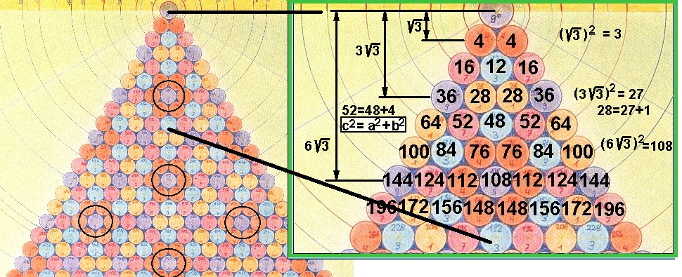 Die links markierten orangenen Ringe in der Mitte liegen auf den Längen 108, 432, 972, 1728 und 2700, also bei den Quadratzahlen von 6, 12, 18, 24, 30 mal Drei. Quersummenfarben sind violett=9=0(Kern), orange=4, hellblau=3(Sog), gelb=1, rot=7. Die 2, 5, 6(Sog) und 8 fehlen hier.