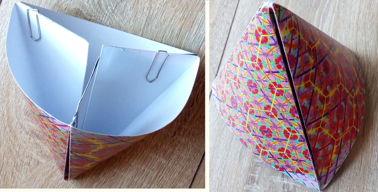 Je enger man sie drückt, desto gekrümmter werden außen die Oberflächen des Papiers. Aus einer dreiseitigen Pyramide wird ein Kegel. Ich fand das spannend und faszinierend.